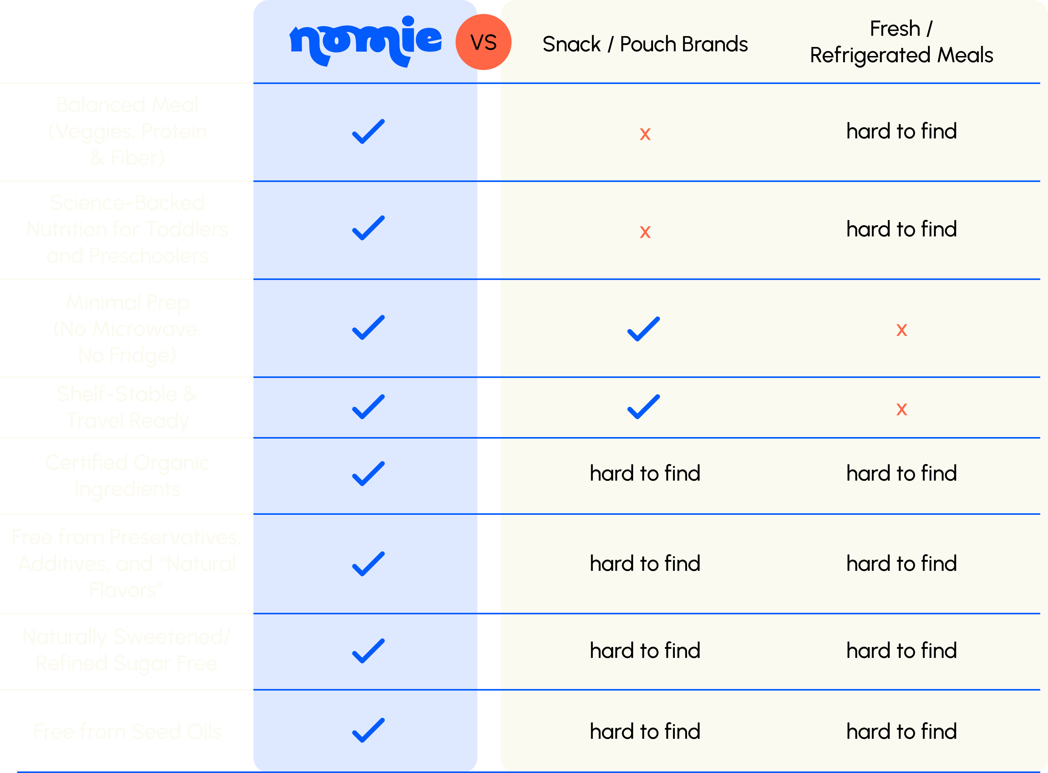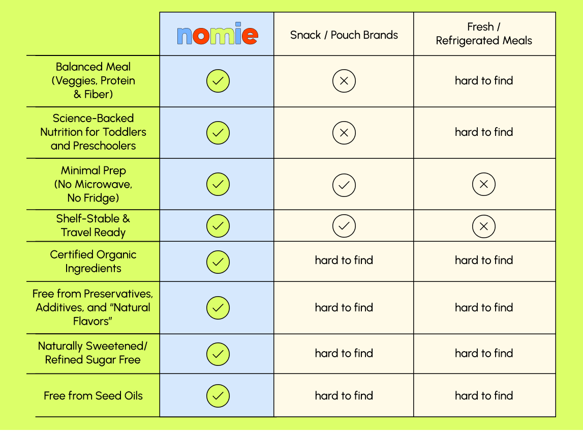 Most brands make you choose between healthy and hassle-free. Nomie combines the convenience parents crave with the nutrition kids actually need.